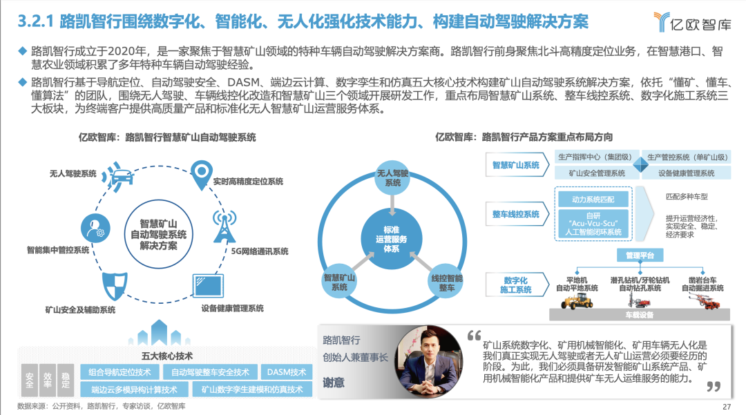 《报告》还聚焦了路凯智行整体解决方案和落地项目案例。表示,路凯智行依托“懂矿、懂车、 懂算法”的团队,围绕无人驾驶、车辆线控化改造和智慧矿山三个领域开展研发工作,重点布局智慧矿山系统、整车线控系统、无人驾驶系统大板块,为矿山客户提供高质量产品和标准化无人智慧矿山运营服务。路凯智行已成功合作多个矿山无人驾驶项目,取得傲人成就。