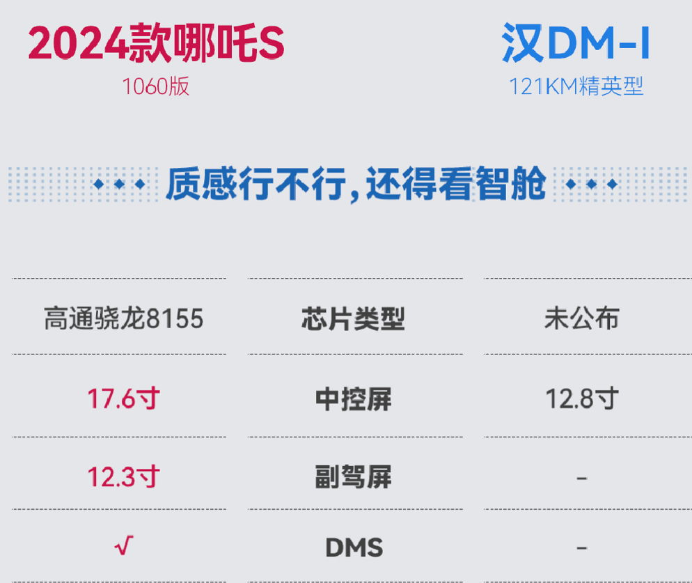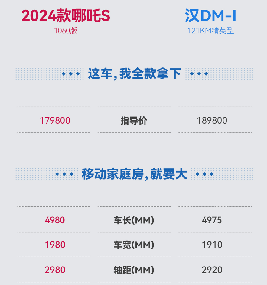那么,哪吒S 1060版这一超帅轿跑,究竟在现有市场环境中表现如何?能否承担起消费者对其的期待?我们现在就将2024款哪吒S 1060版与卖的比较好的比亚迪汉DM-i冠军版121km精英型(以下简称“比亚迪汉DM-i”)做个比较,看看2024款哪吒S 1060版真实的表现如何?让产品自己来说话!