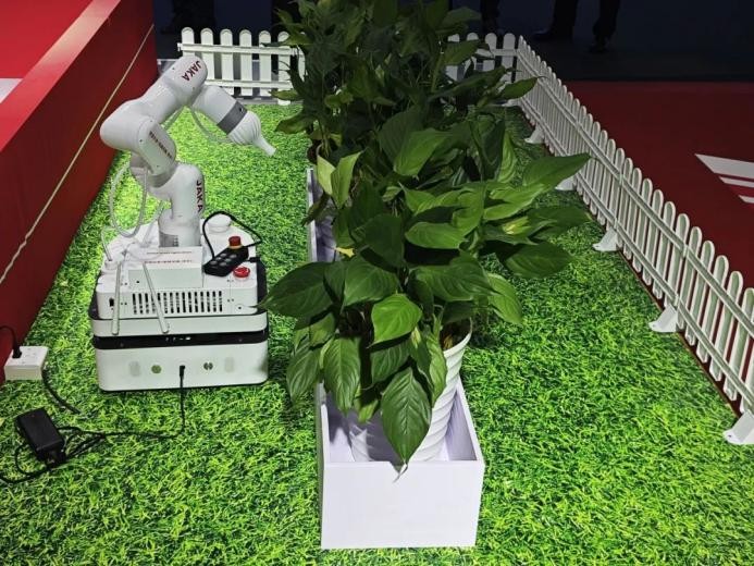 节卡机器人与AGV集成实现SLAM构建地图、自动导航避障。节卡机器人通过设定动作轨迹,控制喷水高度和范围,确保有效范围内浇水频次,可定时定量完成绿植果蔬养护工作。这套应用还可拓展到果蔬采摘、农药喷洒等众多场景,促进智慧农业现代化、高质量发展。