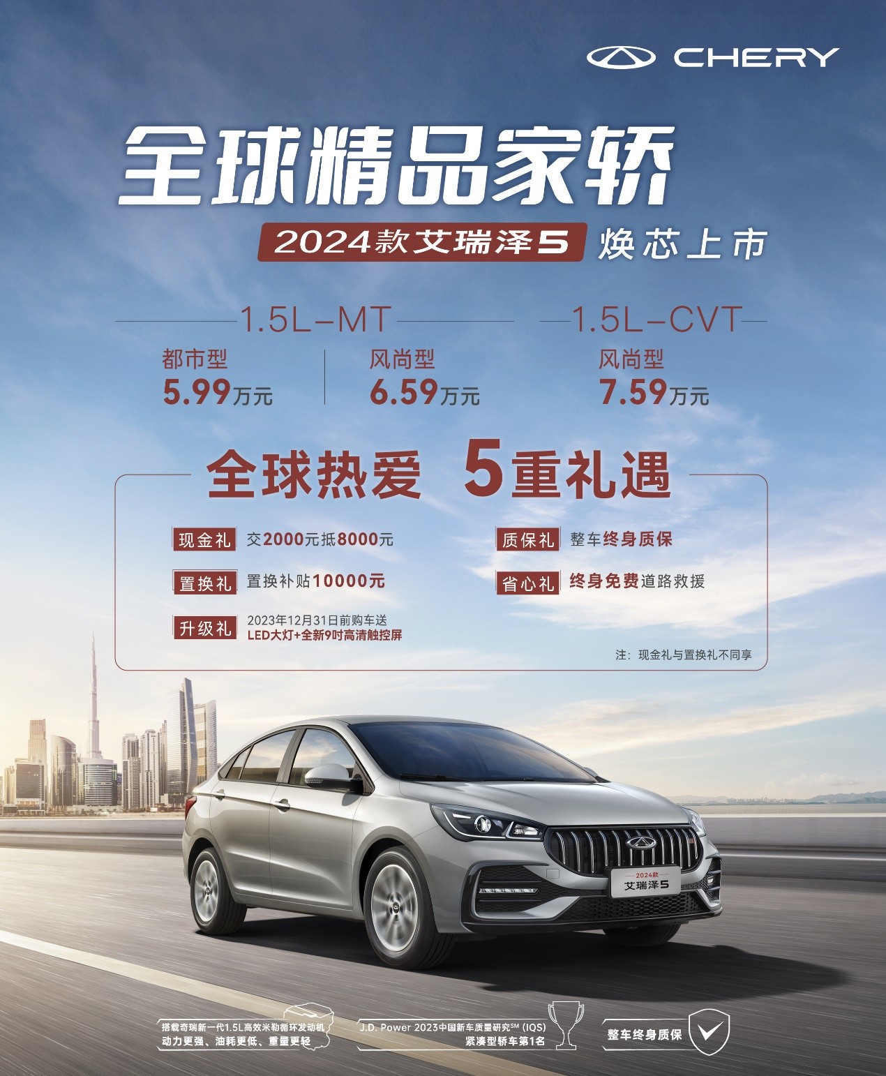 “全球精品家轿”2024款艾瑞泽5焕芯上市,宠粉价5.99万元起
