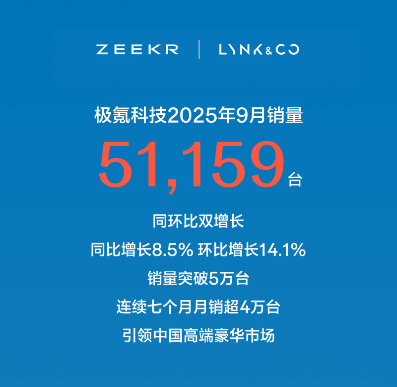 快讯:极氪科技9月销量51,159台,连续7个月月销超4万台